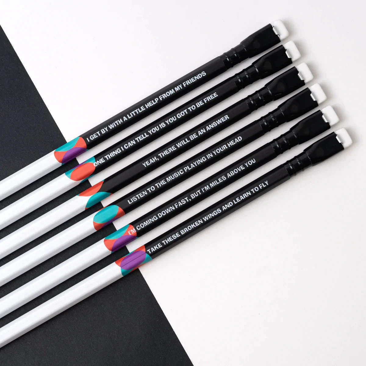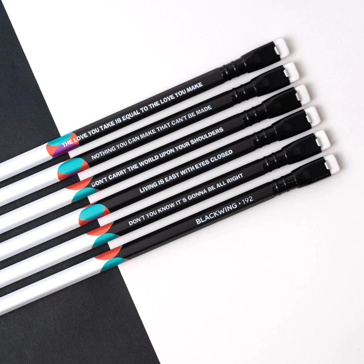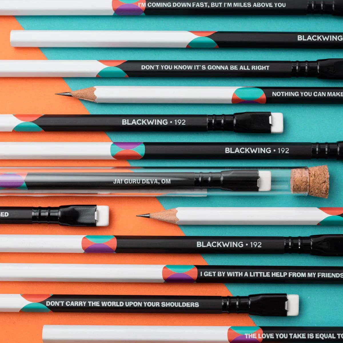 Blackwing 192 is a tribute to Lennon and McCartney and the estimated 192 songs they wrote together. The color prism design depicts the convergence of two powerful creative forces. A different Lennon-McCartney lyric is foil stamped on each pencil, for a total of twelve different lyrics in the set. Includes extra-firm graphite.