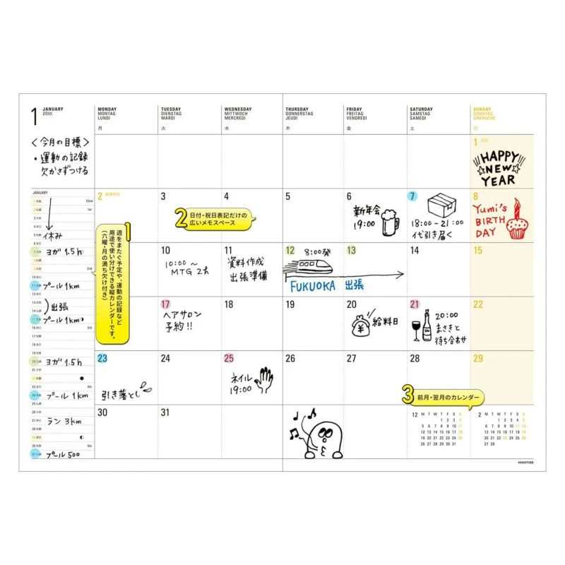 - Content: Includes Calendar, Yearly Schedule, Monthly Schedule, Notes, Personal Data