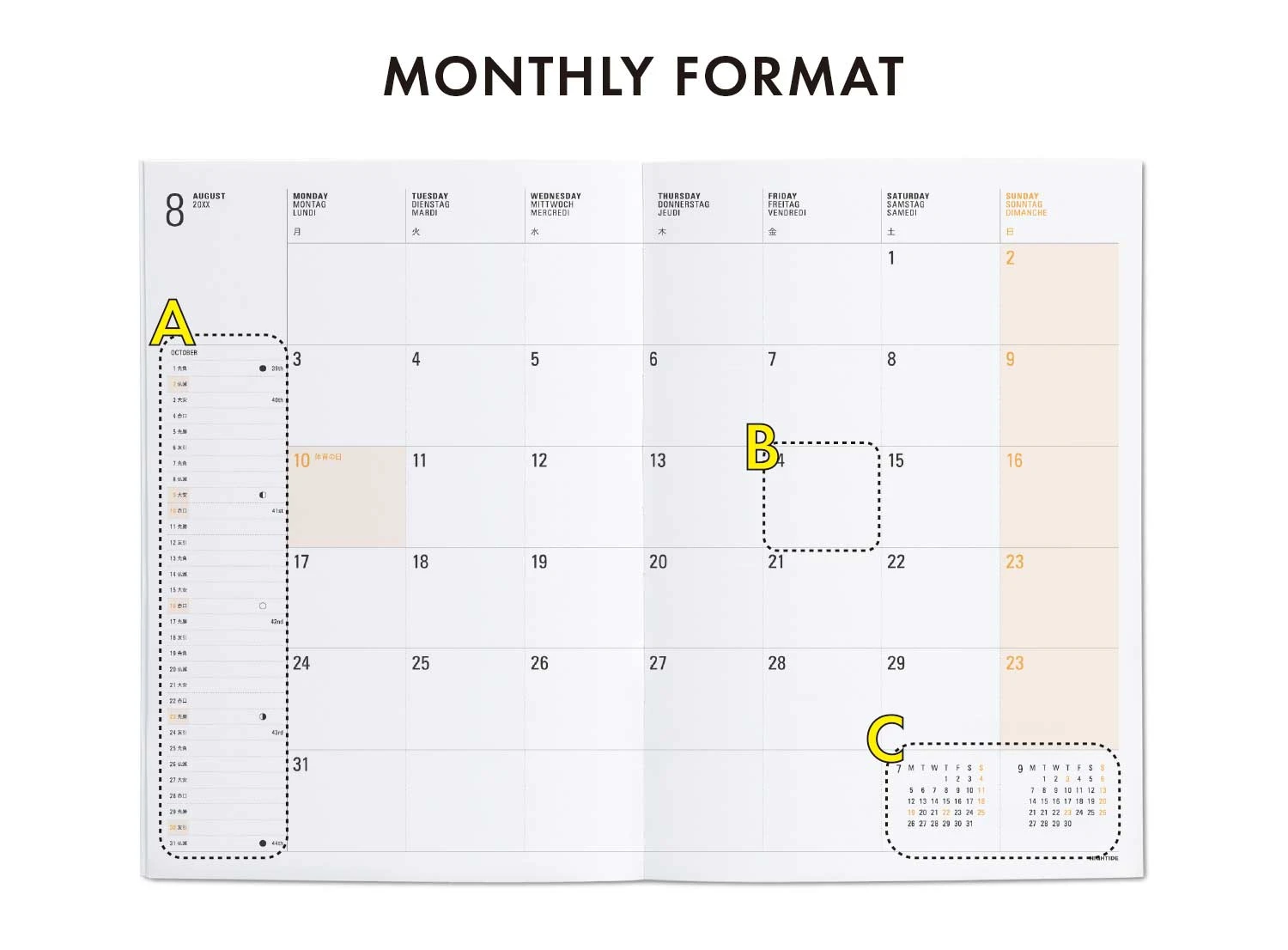 - (B) By consolidating Rokuyō and moon phases to the left, ample memo space is secured solely for day and holiday notations.