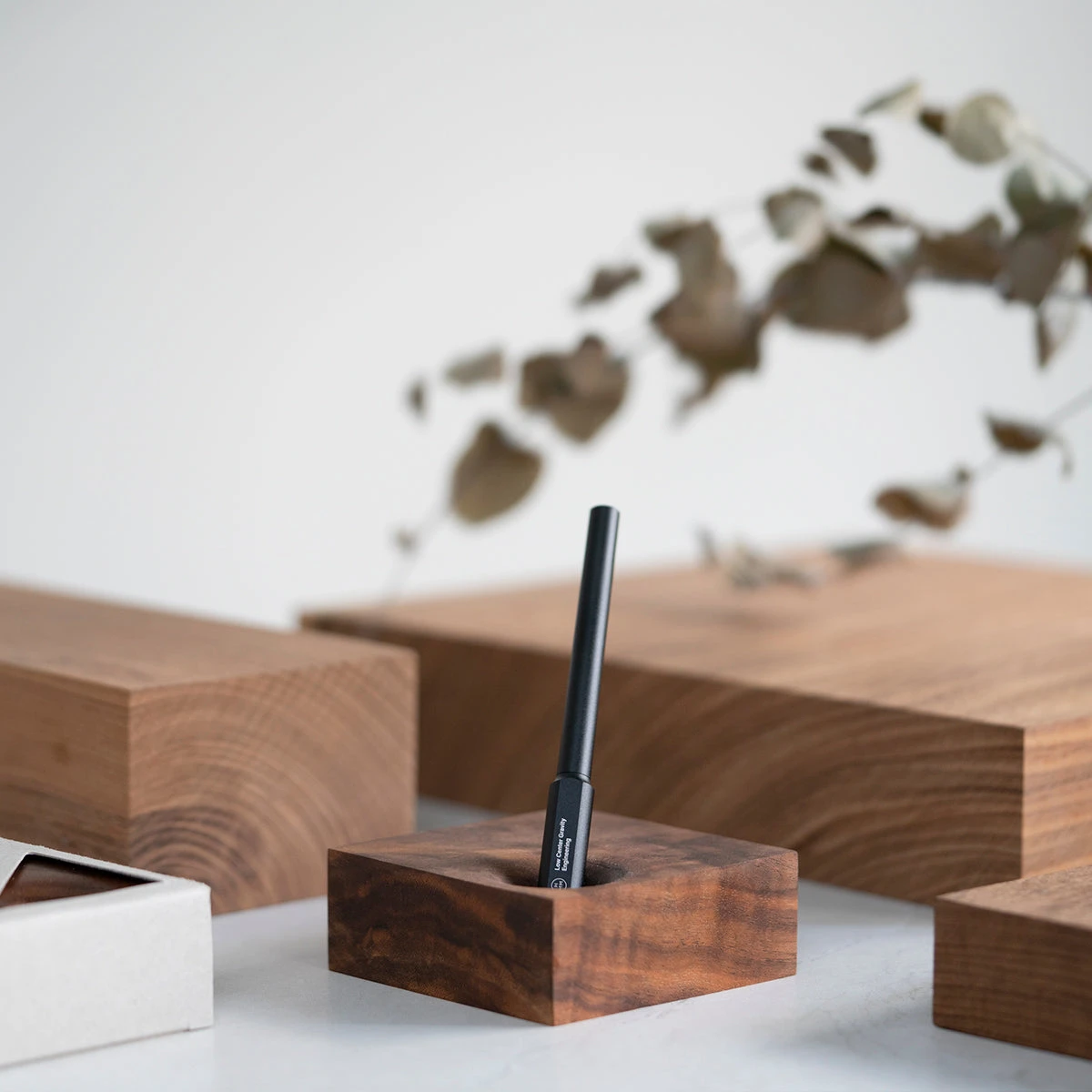 Bring a sense of calm to your workspace with the HMM Walnut Block. Made from solid walnut wood with a curvy, refined hole, it serves as both a practical pen holder and an elegant desk accessory. Designed to accommodate any regular pen models, this block adds to the ambiance of any home or office.