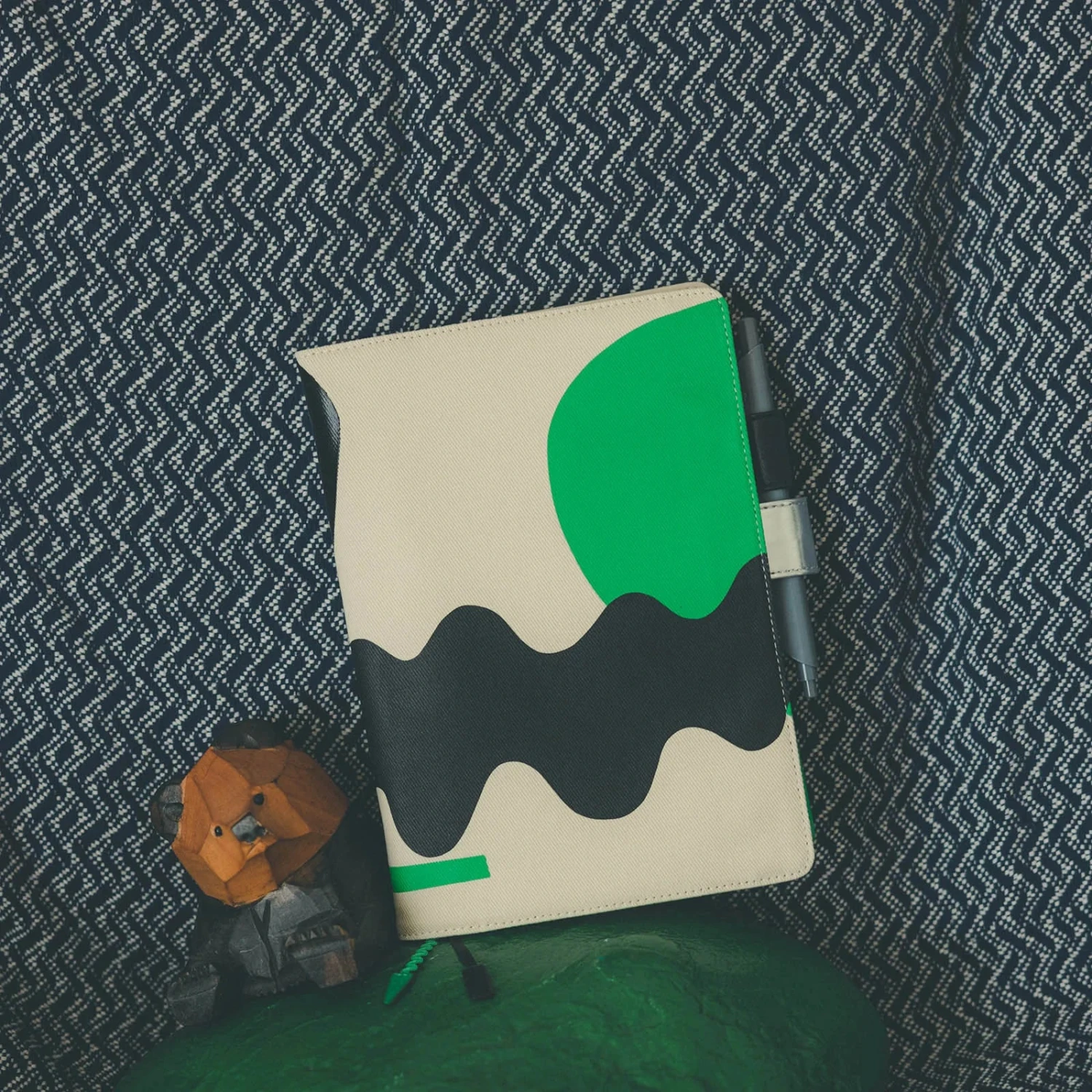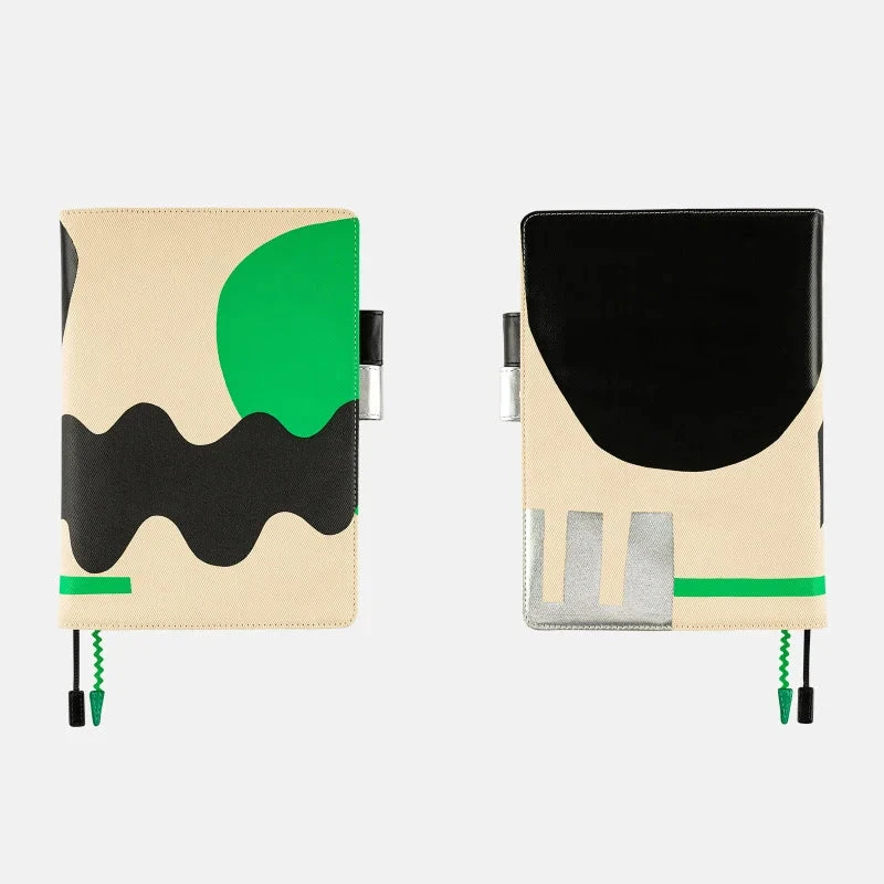 The cover’s cream-coloured cotton material is given a pop-art look with green, black, and silver shapes drawn organically around the design. The green and matte black sections are silkscreen printed, while the silver and shiny black sections are foil-printed, giving the cover an elaborate design.