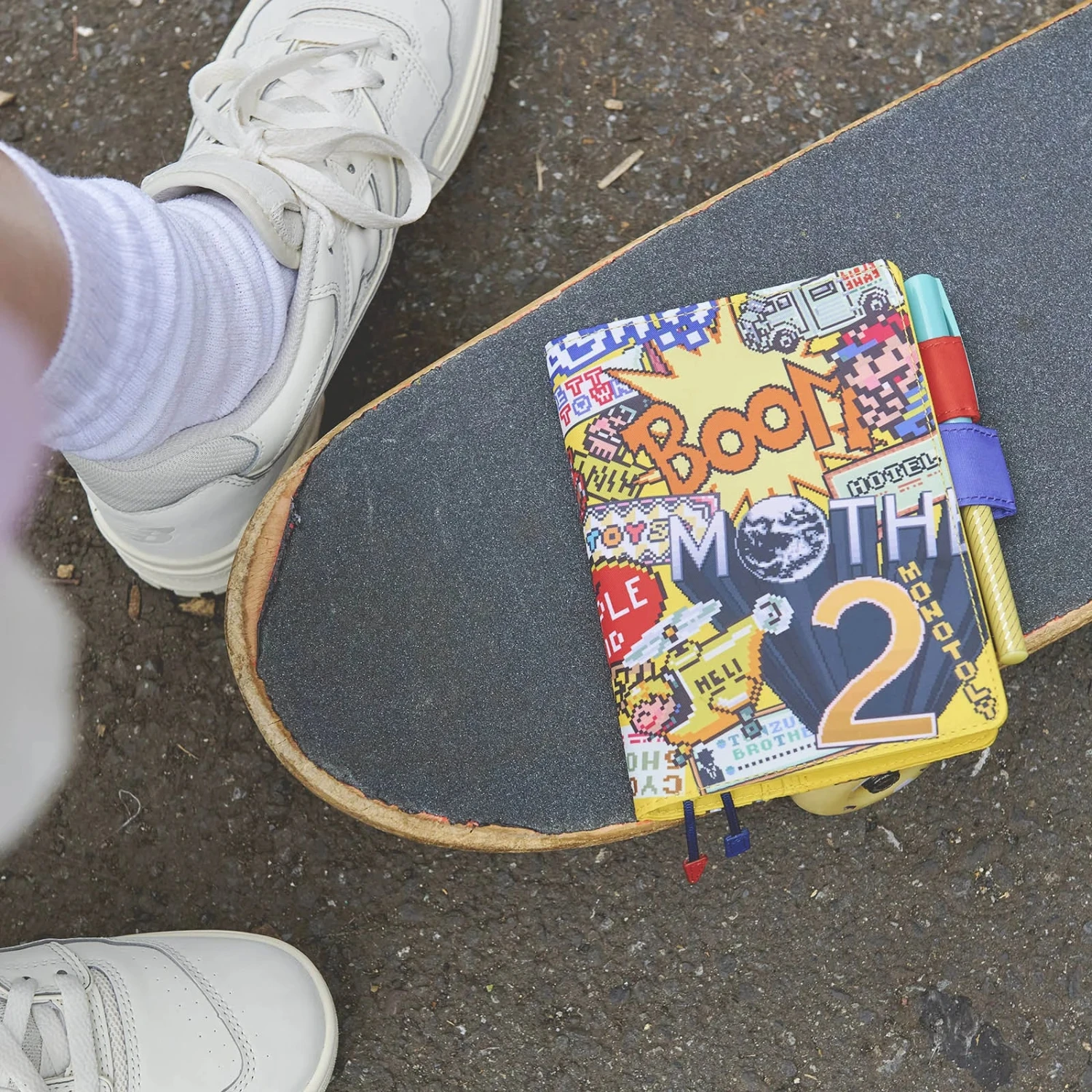 Original A6 cover Attention!, Cousin A5 size cover Boing!, Hobonichi Techo HON “EarthBound Beginnings” hardcover book in A6 size and A5 size, and the Summers design for the Weeks.