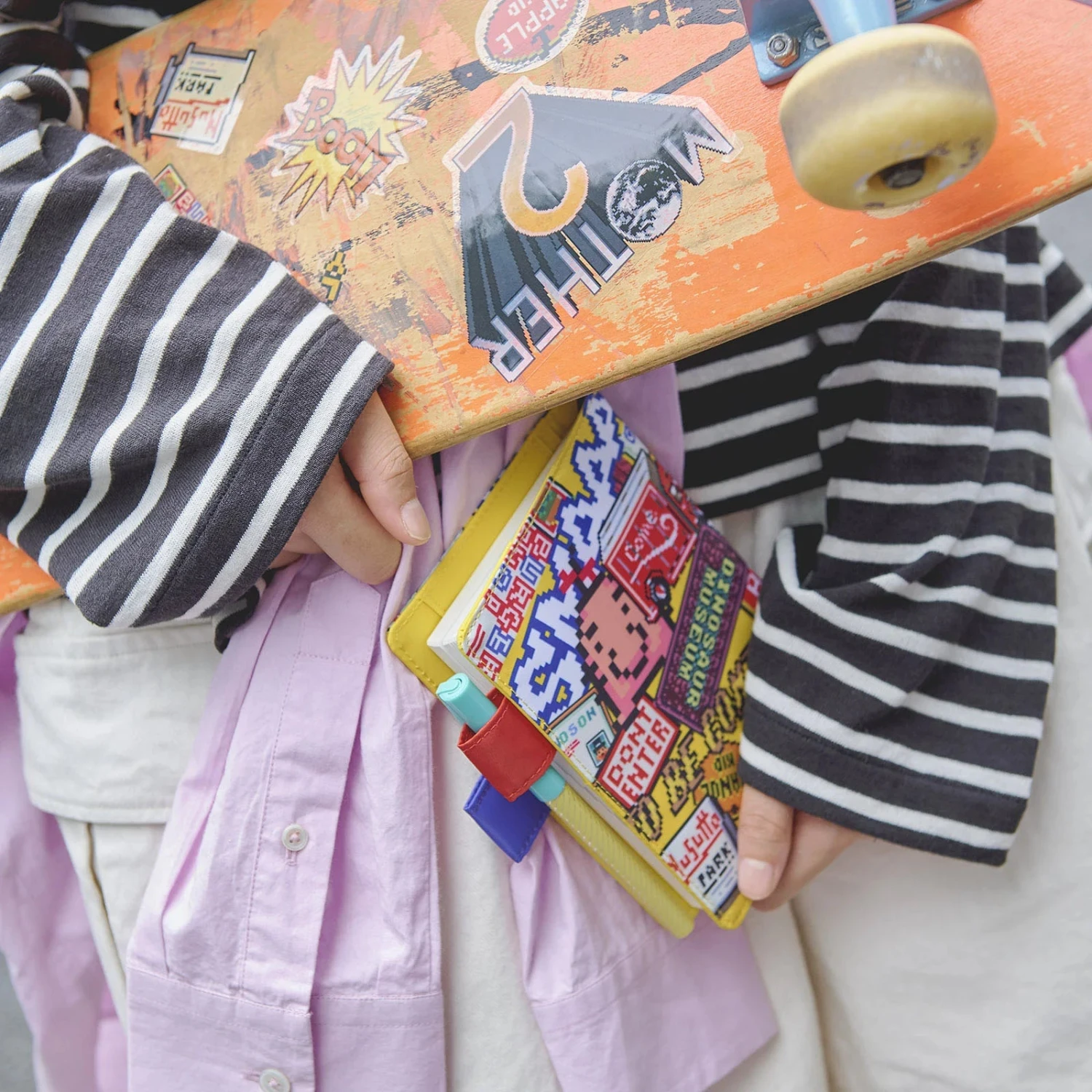 The vibrantly printed design shows a playful depiction of stickers plastered all over the front and back of the cover.