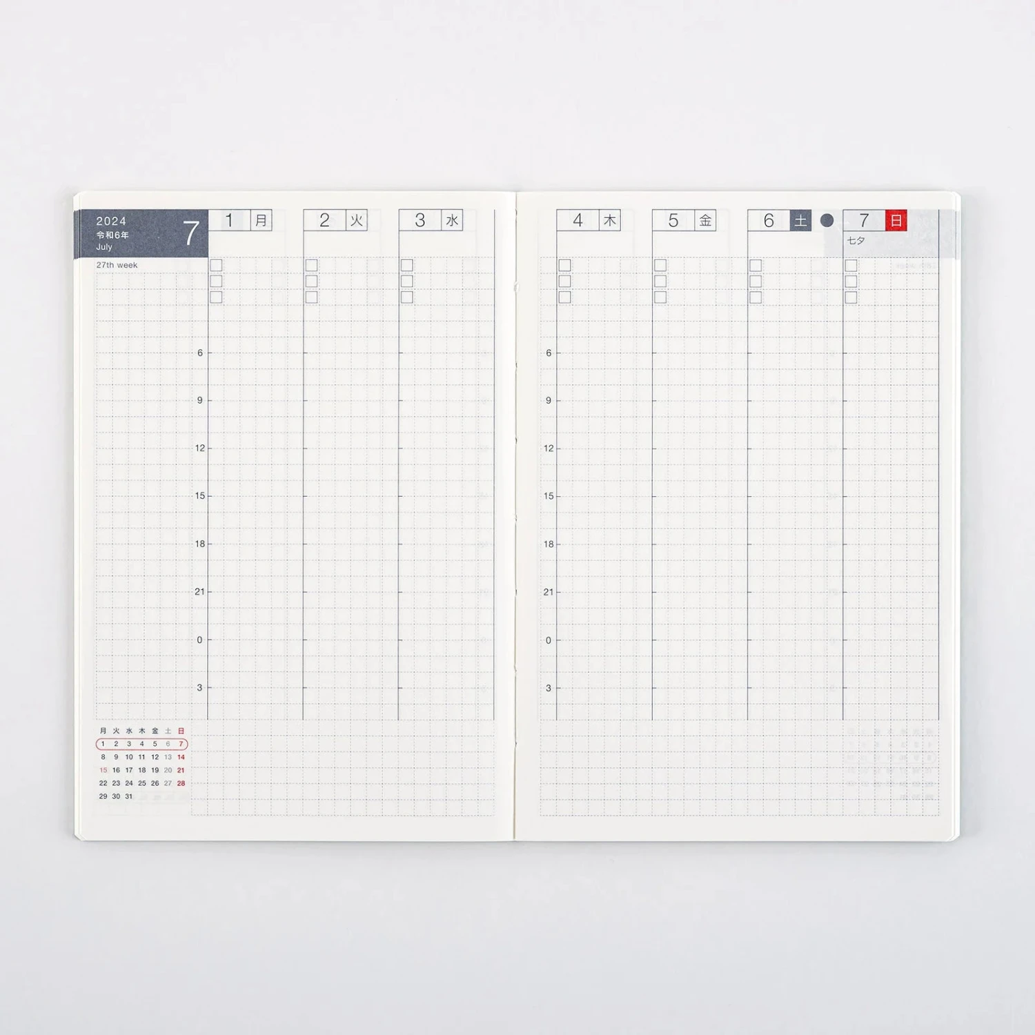 The Hobonichi weekly calendar is a supplement to the A6 Hobonichi Techo Planner / Original. Each two-page spread covers an entire week, and the booklet covers an entire year. Each daily column includes a full 24-hour timeline and three checkboxes at the top. The booklet is thin, also uses Tomoe River paper, lays completely flat, and fits perfectly into a cover pocket due to its slightly smaller size than the planner book.
