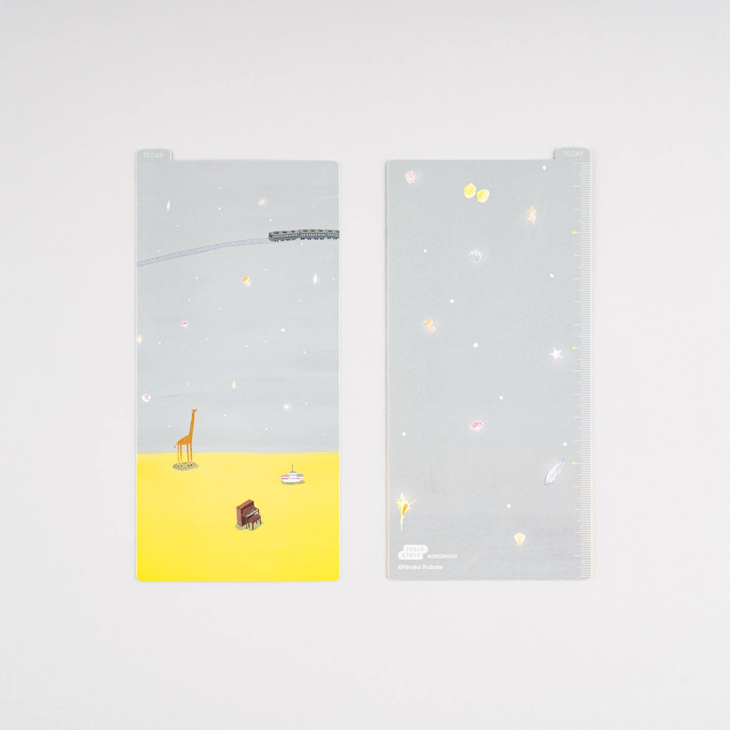 The illustration for the Weeks size is featured in this year’s techo cover titled Twinkle-shells. The train running across the sky and the stars in the shape of seashells create a dream-like view with a sense of quietness.
