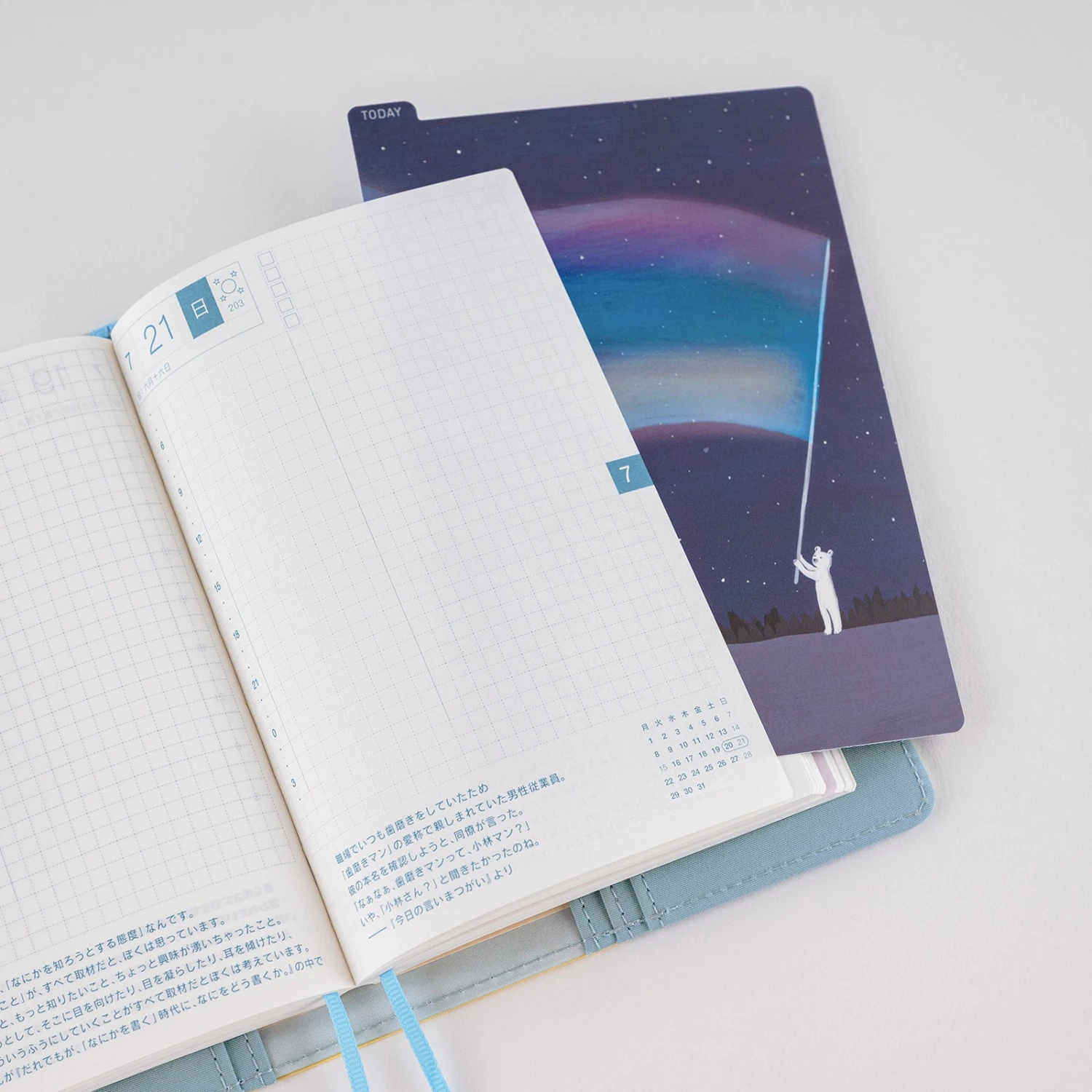 The A6 size is called Aurora Duty. This illustration was used for the English edition exclusive Weeks design and the Hobonichi Paper(s) in the Hobonichi Techo 2023 lineup. It shows a polar bear “on duty” to draw an aurora across the sky.