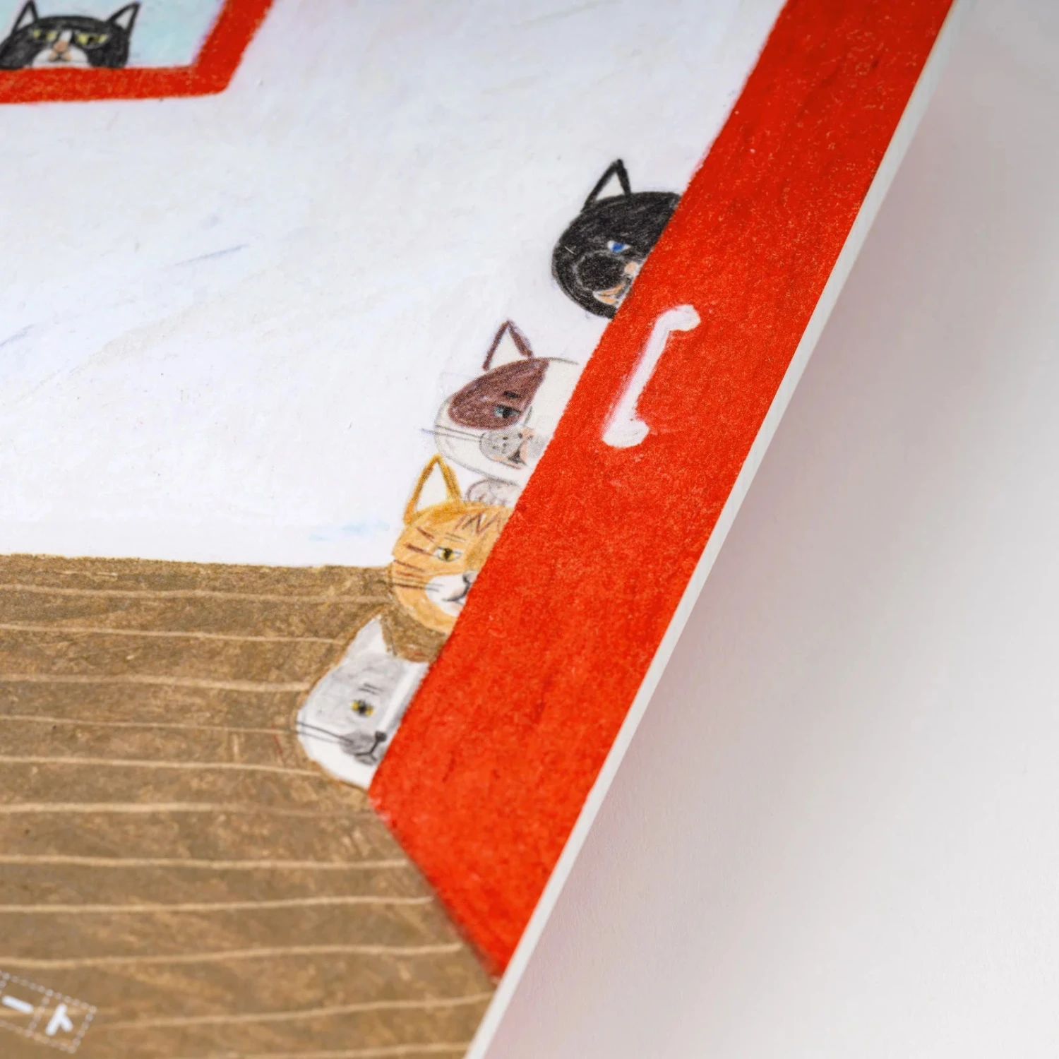 “Who is it?” depicts cats noticing the sound of a guest that has come to their house and staring at the front door from the room door and even from outside the window. Are the cats in a welcoming mood, or are they trying to see if they can let the guest inside?