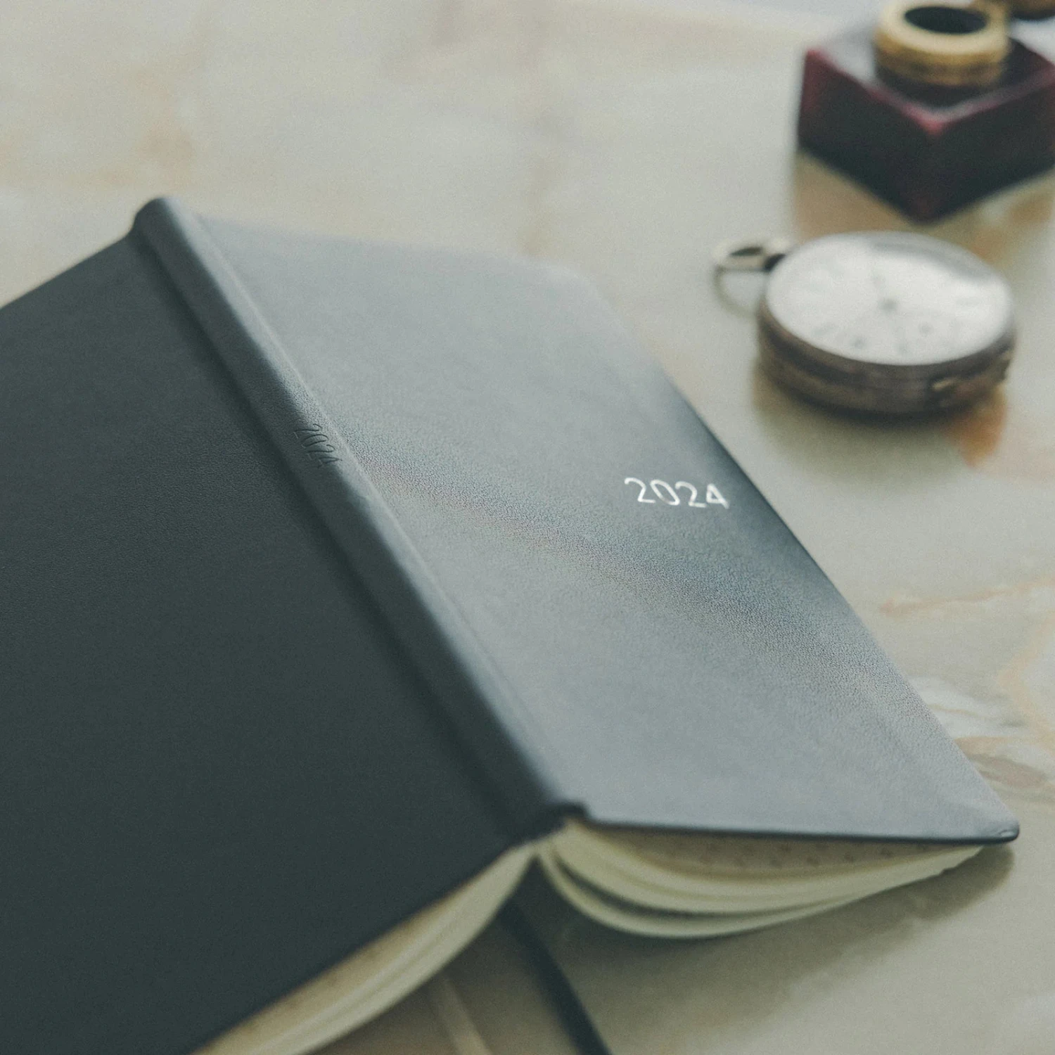 Classical Navy uses leather dyed in a deep navy. The calming colour will be fitting to any setting. The year 2024 is foil-pressed in silver and sparkles when it catches the light.