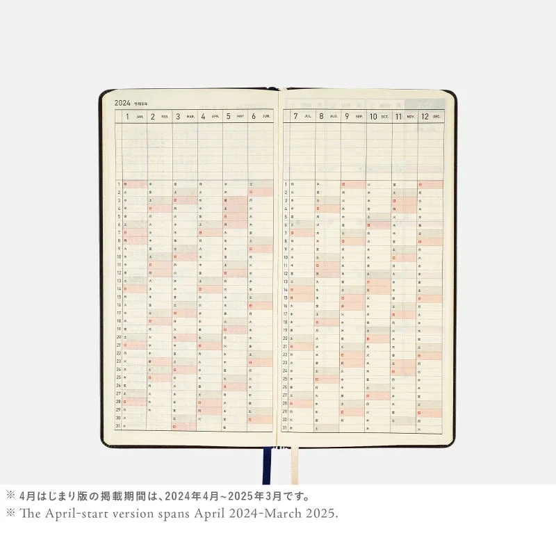 Language Japanese Pages 240 pages Paper Type / Binding Thin, light Tomoe River S paper resistant to bleeding and designed for planners / Stitch-binding Graph Paper Size 3.55 mm Start of Week Monday-start week Yearly Calendar 2023, 2024, 2025 Yearly Index Apr. 2024 – Mar. 2025 (2 pages) Monthly Calendar Mar. 2024 – Apr. 2025 (28 pages) Daily Quotes One per week (Japanese) Weekly Pages Feb. 26, 2024 – Apr. 6, 2025 (116 pages)