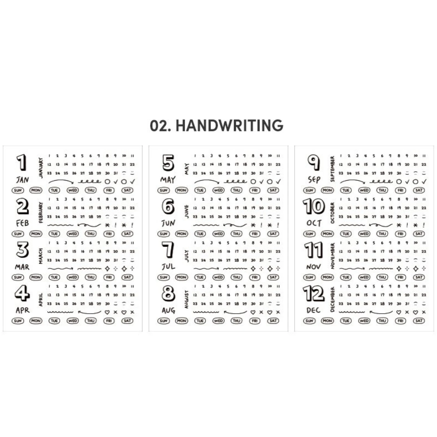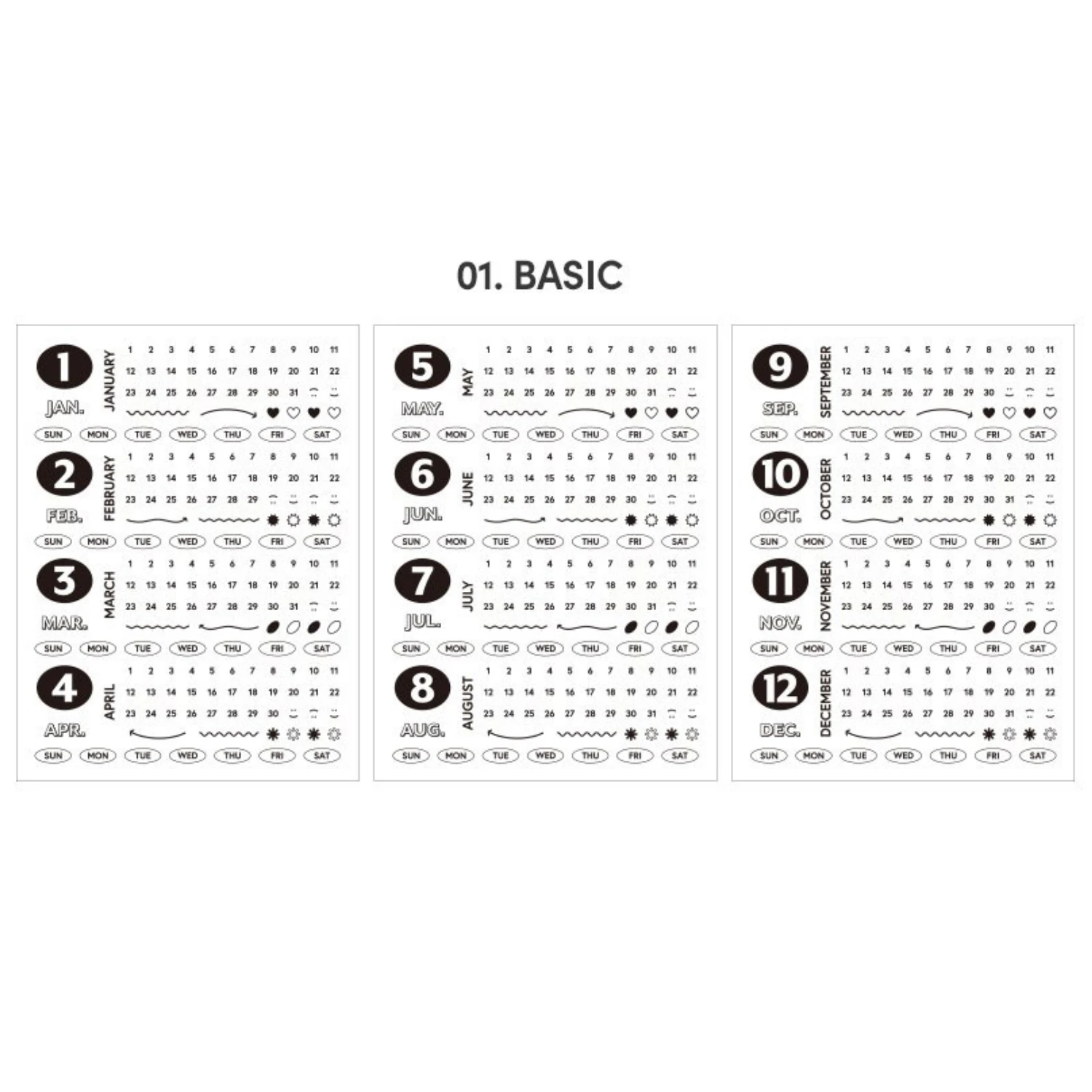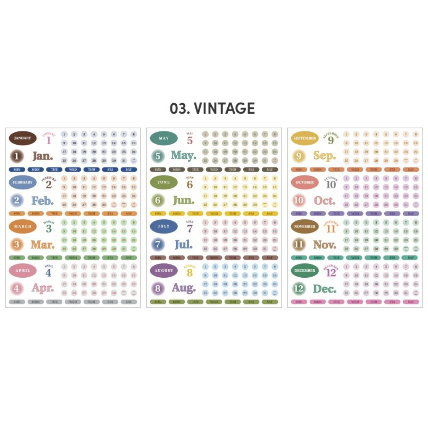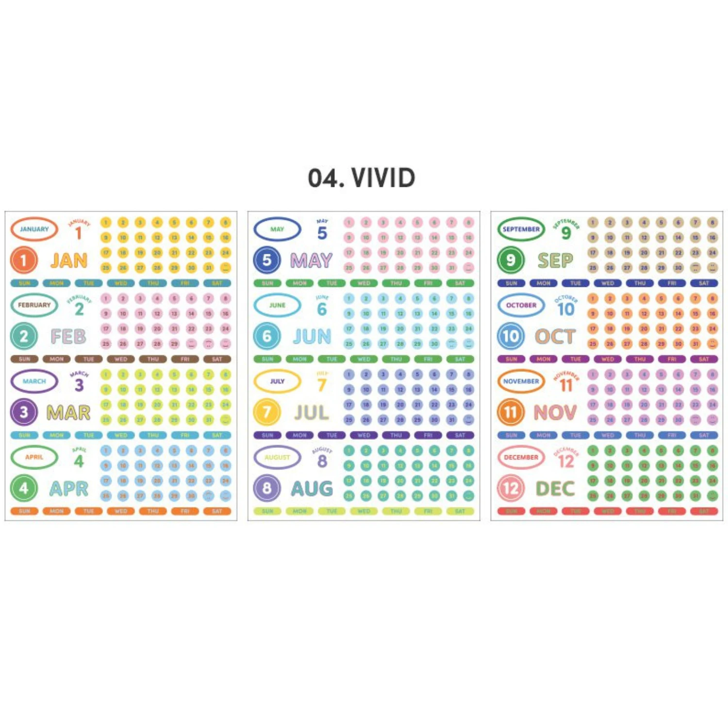 12 months Jan – Dec, the days in each month in a large circle, the days in each month in smaller circular dots, the months spelled out - 3 sheets of stickers in each set