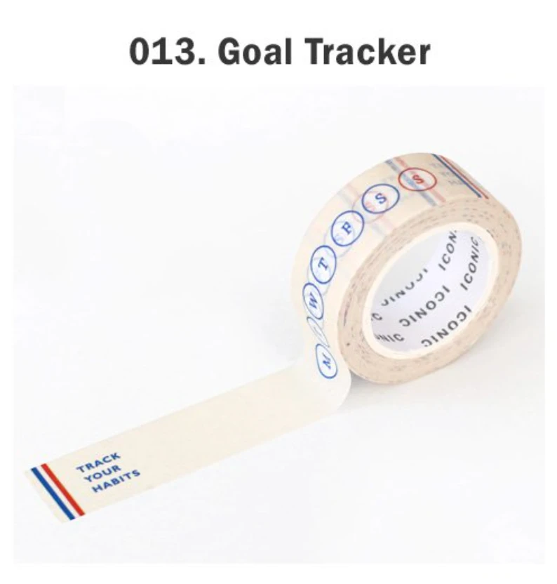 Masking tape with check-boxes to organise your planner pages. Each roll of tape is themed around a different design including goal tracking, daily to-do and so on, in soft pastel colours. The details include check-boxes along the length of the tape so you can create little check-lists in your planner to mark off days, track habits and even measure with the Ruler design.