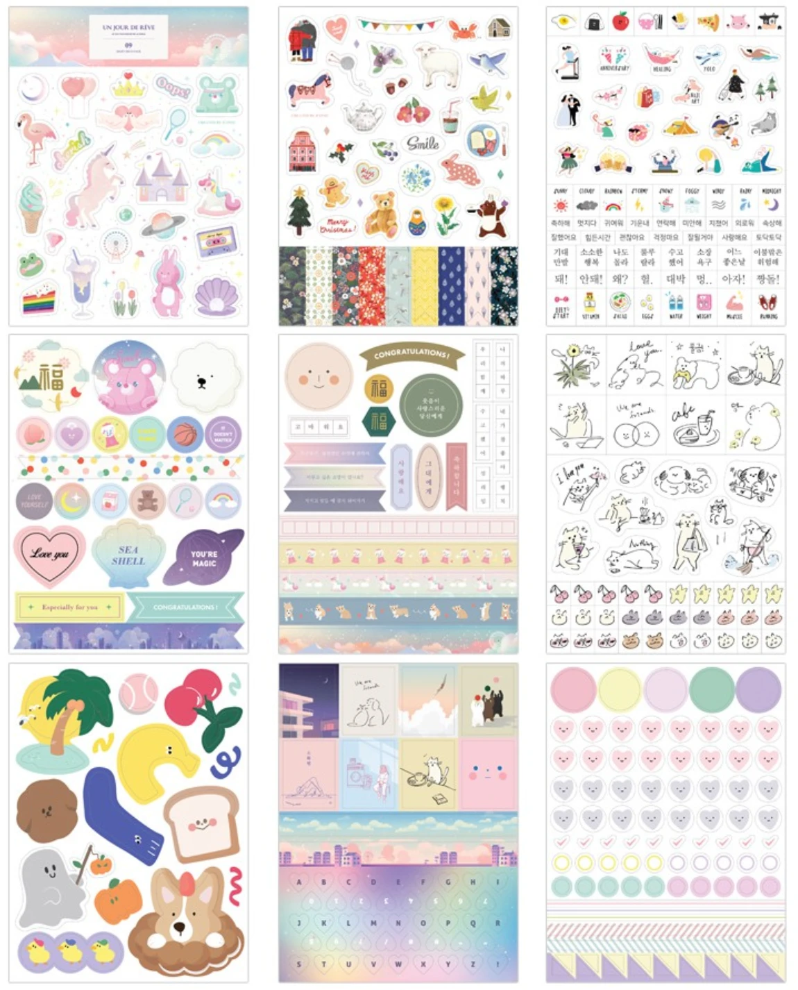 Each pack contains 9 sheets of stickers with a variety of designs per sheet.