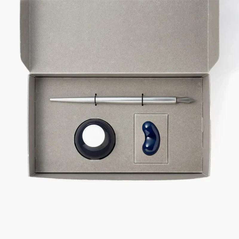 The sleek aluminium nib holder is juxtaposed with a beautiful cobalt blue porcelain pen rest. The set includes ink in Toppuri, a versatile colour that complements the blue Ruri glaze of the pen rest.