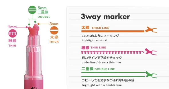 Kokuyo’s 3-way highlighter gives you the flexibility to highlight in three different widths; double, fine, or broad. Depending on the angle at which you use the pen and the tip of the ‘beetle horns’ that you press onto the page, you’ll be able to underline words, highlight thicker lines of text or create thinner lines to cover smaller words / single letters.