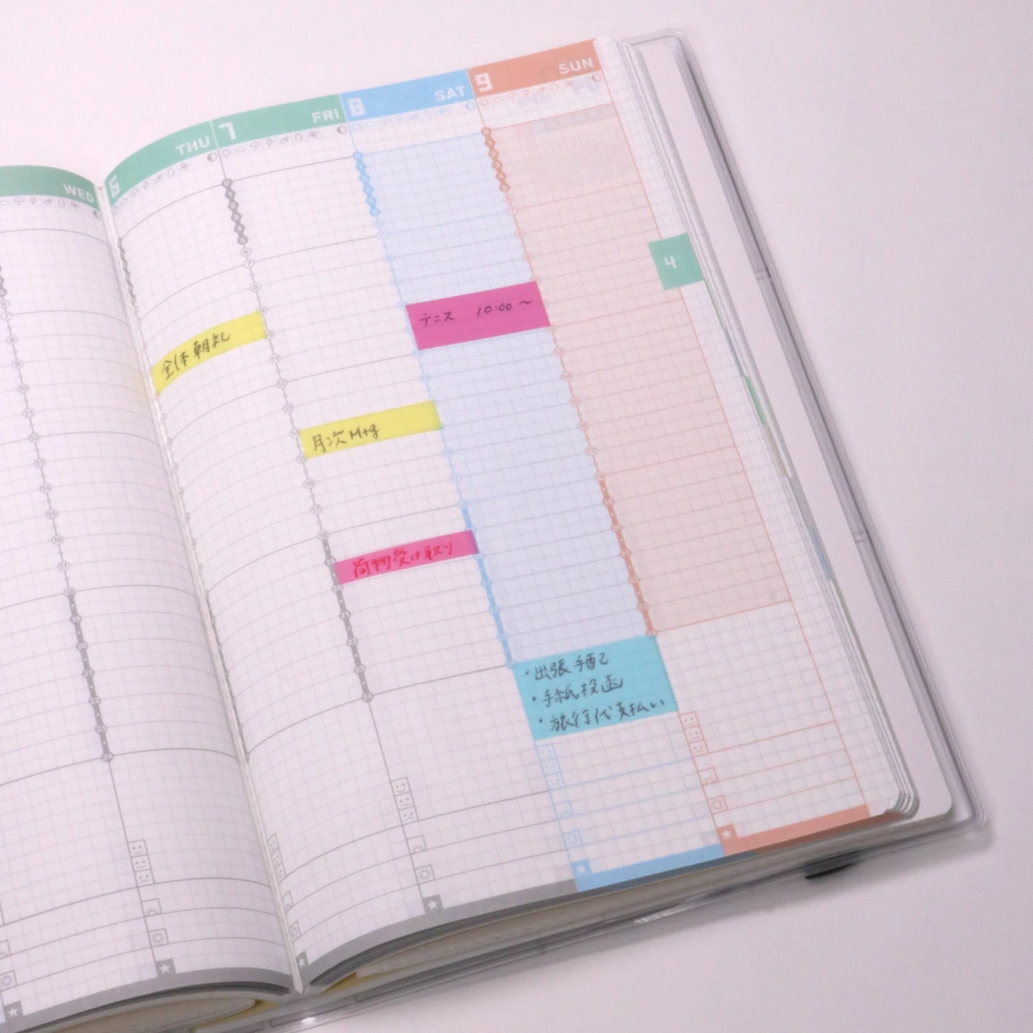 Kokuyo Jibun Techo mini sticky notes are sized to match the width of the weekly vertical and monthly block format planners. These film sticky notes are useful for schedule entries that are not yet confirmed, and items that you want to highlight.