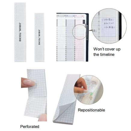 These paper sticky notes are sized precisely to fit the width of the JIBUN TECHO columns. Adjustable length with a perforated line makes it easy to choose just the length of the list you need.