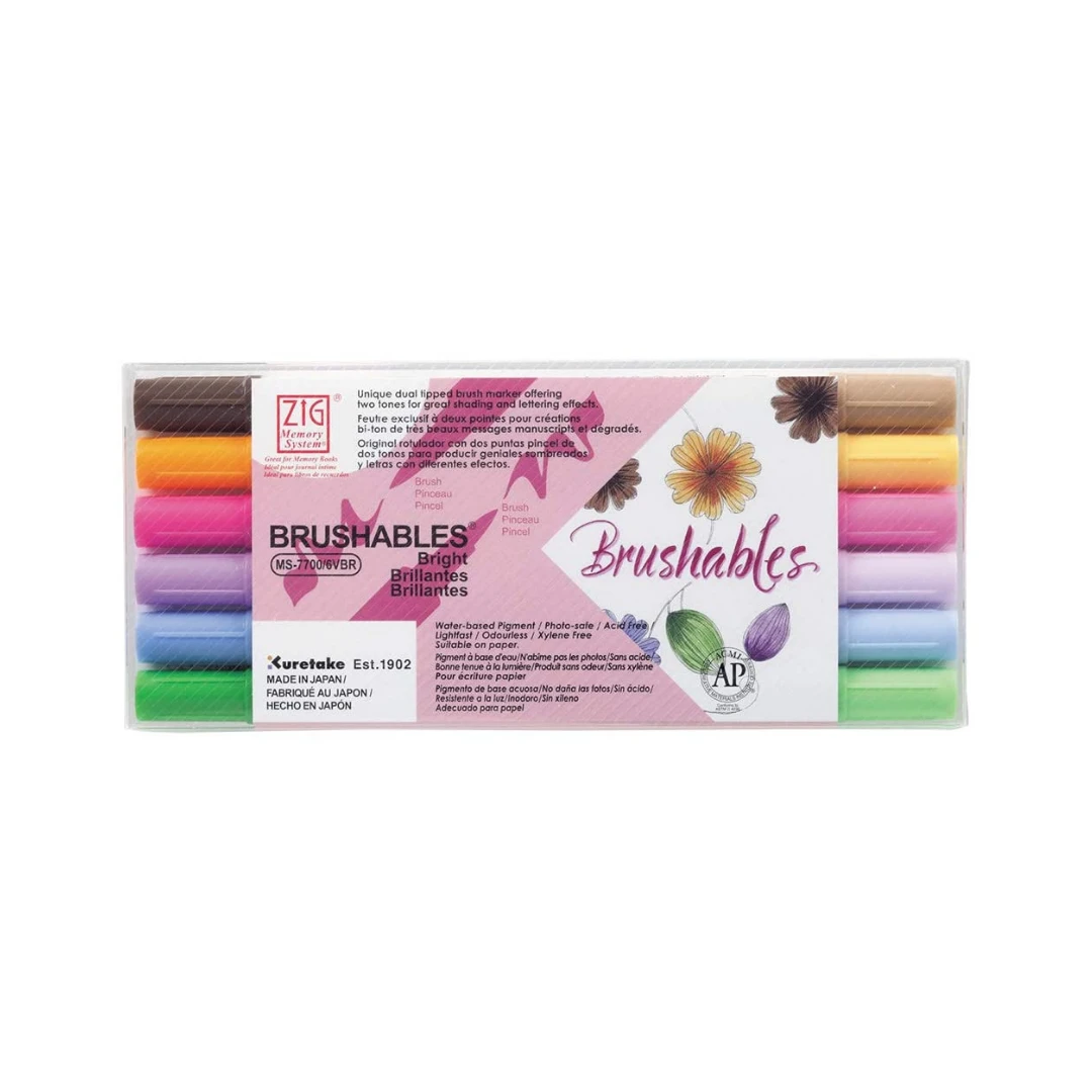 Light up your creations with the Kuretake ZIG Memory System Brushables Bright 6-Colour Set. With dual-tipped markers featuring a vibrant hue on one end and a 50% tint of the same colour on the other, this marker set offers endless possibilities. This water-based pigment ink set is perfect for brush techniques and two-tone blending effects. It’s an ideal choice for scrapbooking, bullet journaling, cardmaking, and artistic projects. Made in Japan, these marker pens are photo-safe, lightfast, odourless, and xylene-free.