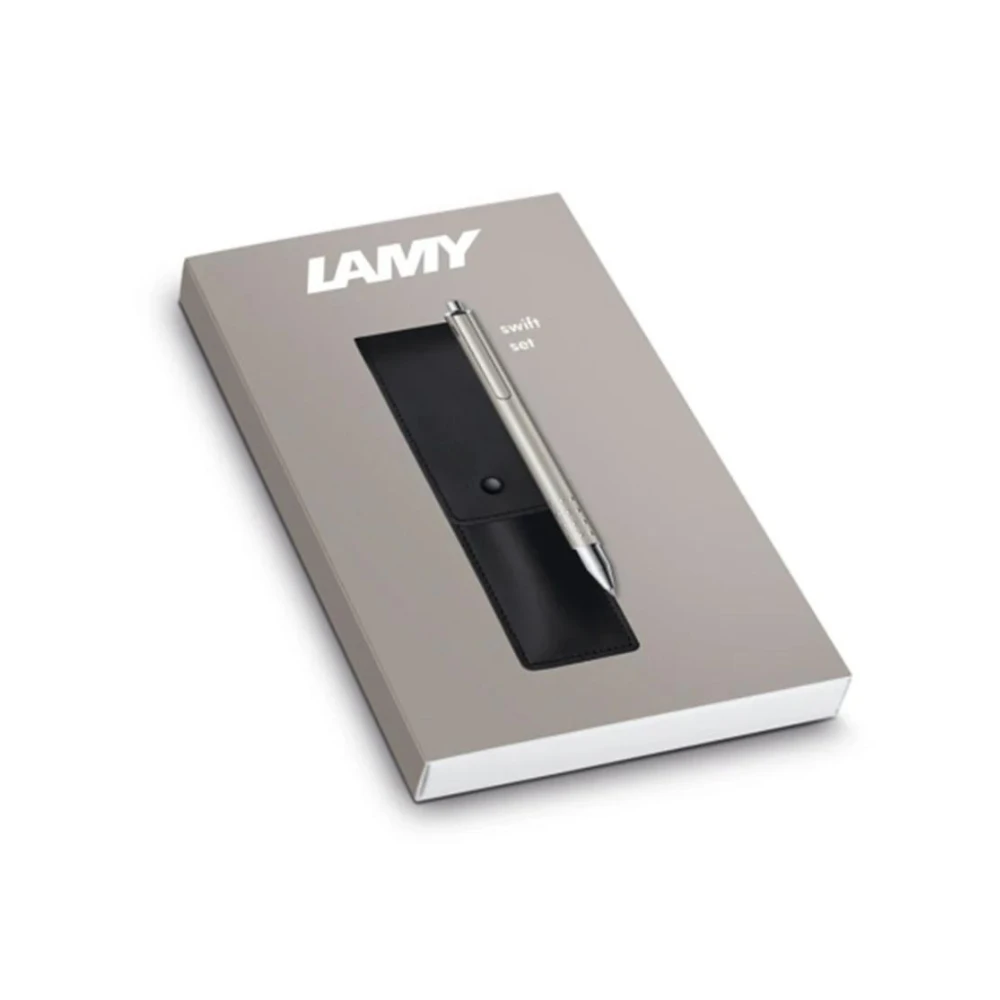 Set consisting of LAMY swift Palladium, with refill LAMY M66 B blue and a genuine leather case for a maximum of two writing instruments in a gift box.