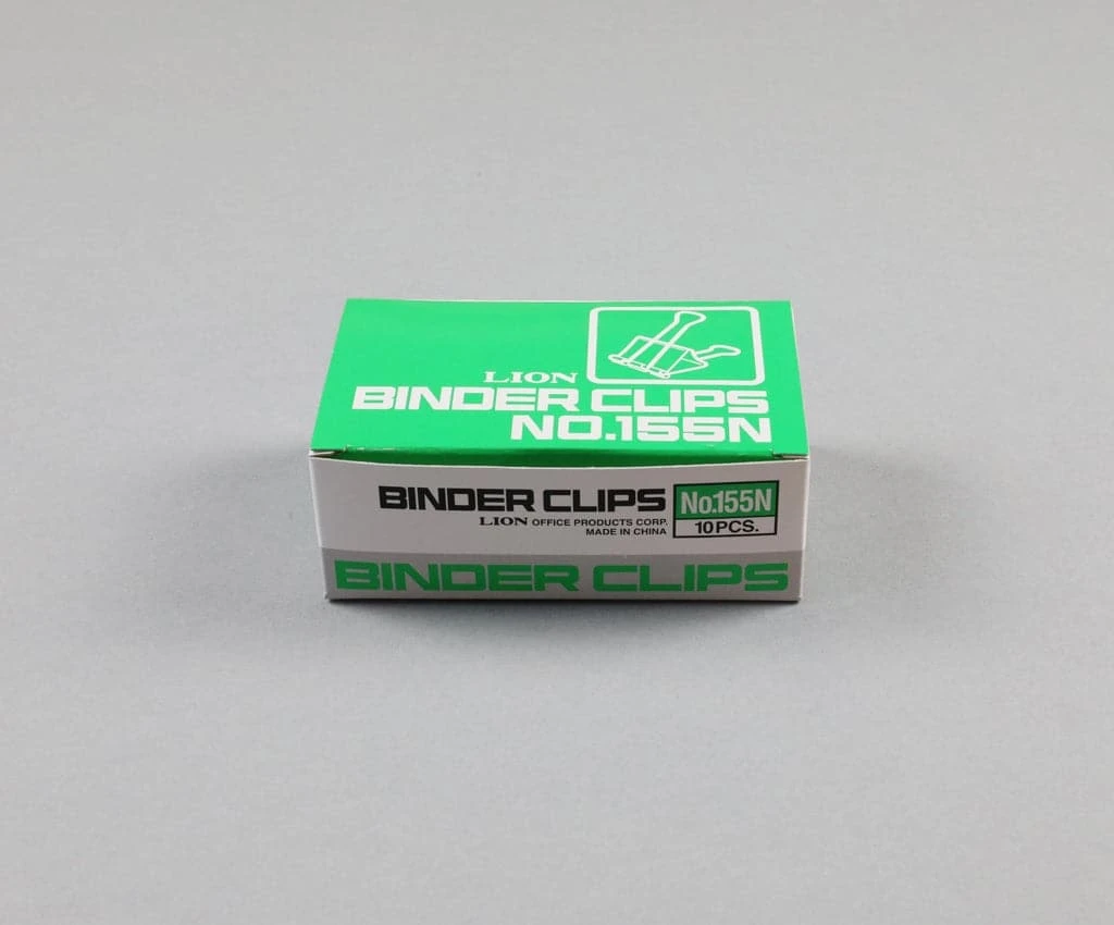 A box containing 10 nickel plated binder clips from Lion.