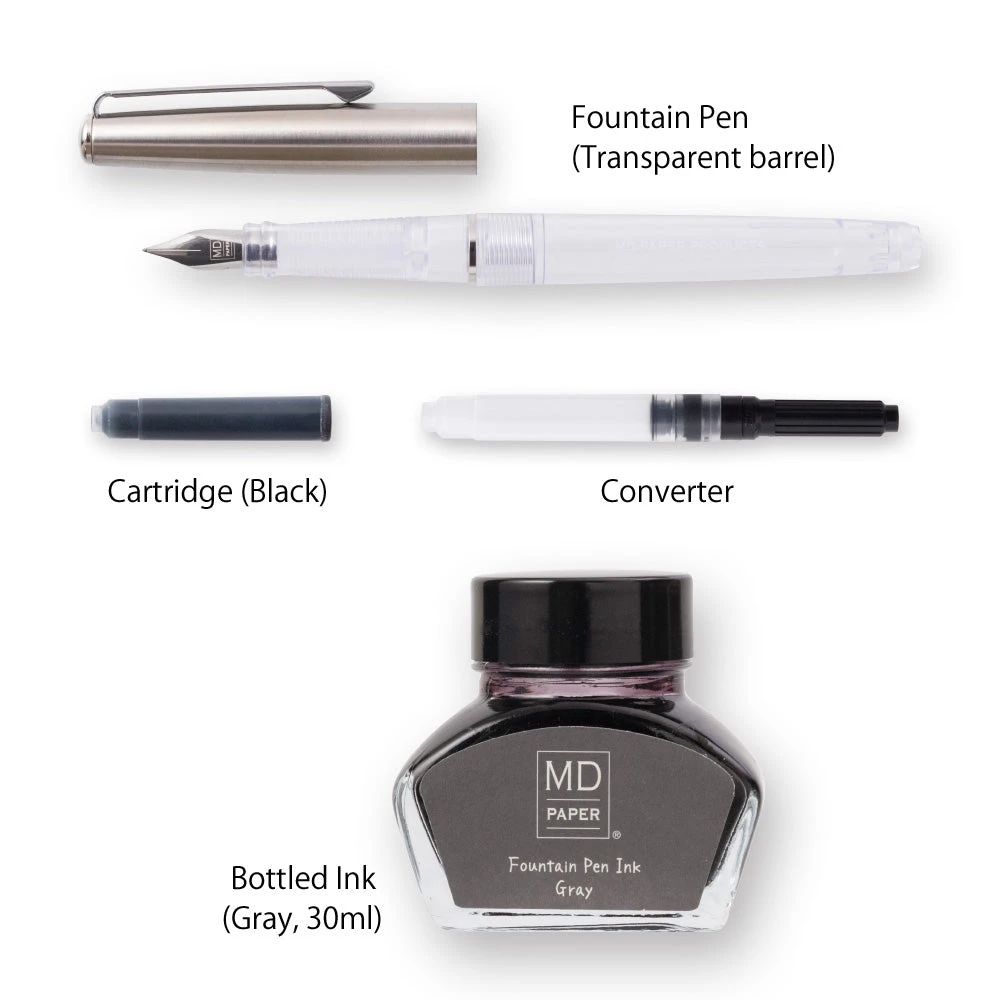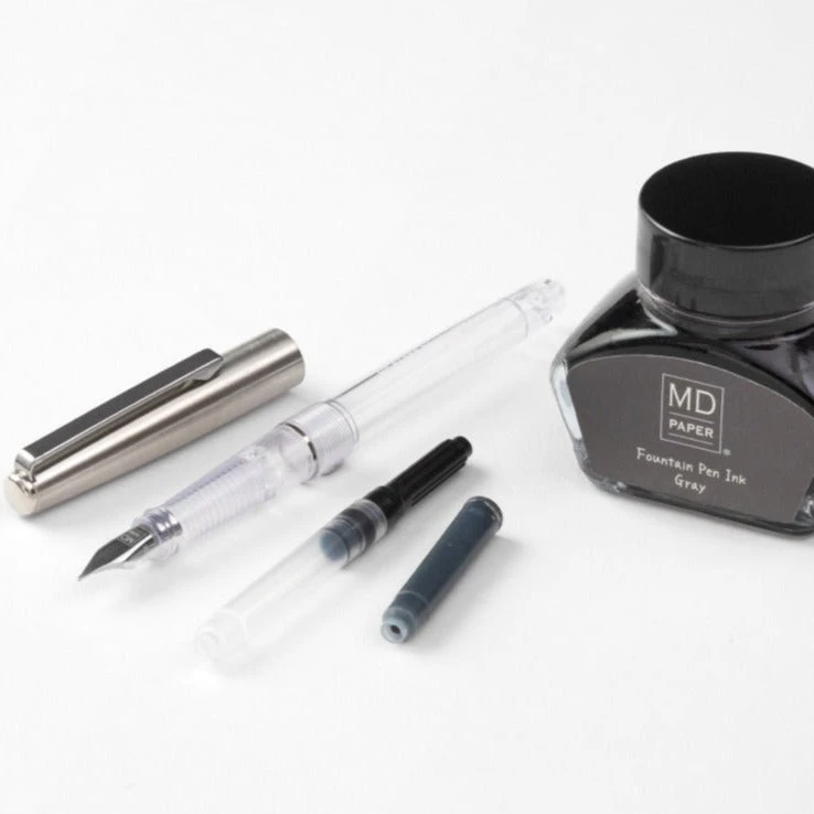 Very much like MD Paper, the fountain pen design is minimal yet leaves a strong impression. Featuring a clear plastic barrel , a metal cap, and a medium stainless steel nib, the fountain pen is of course a perfect match for MD Paper products but will also work well with any type of fountain pen friendly paper.