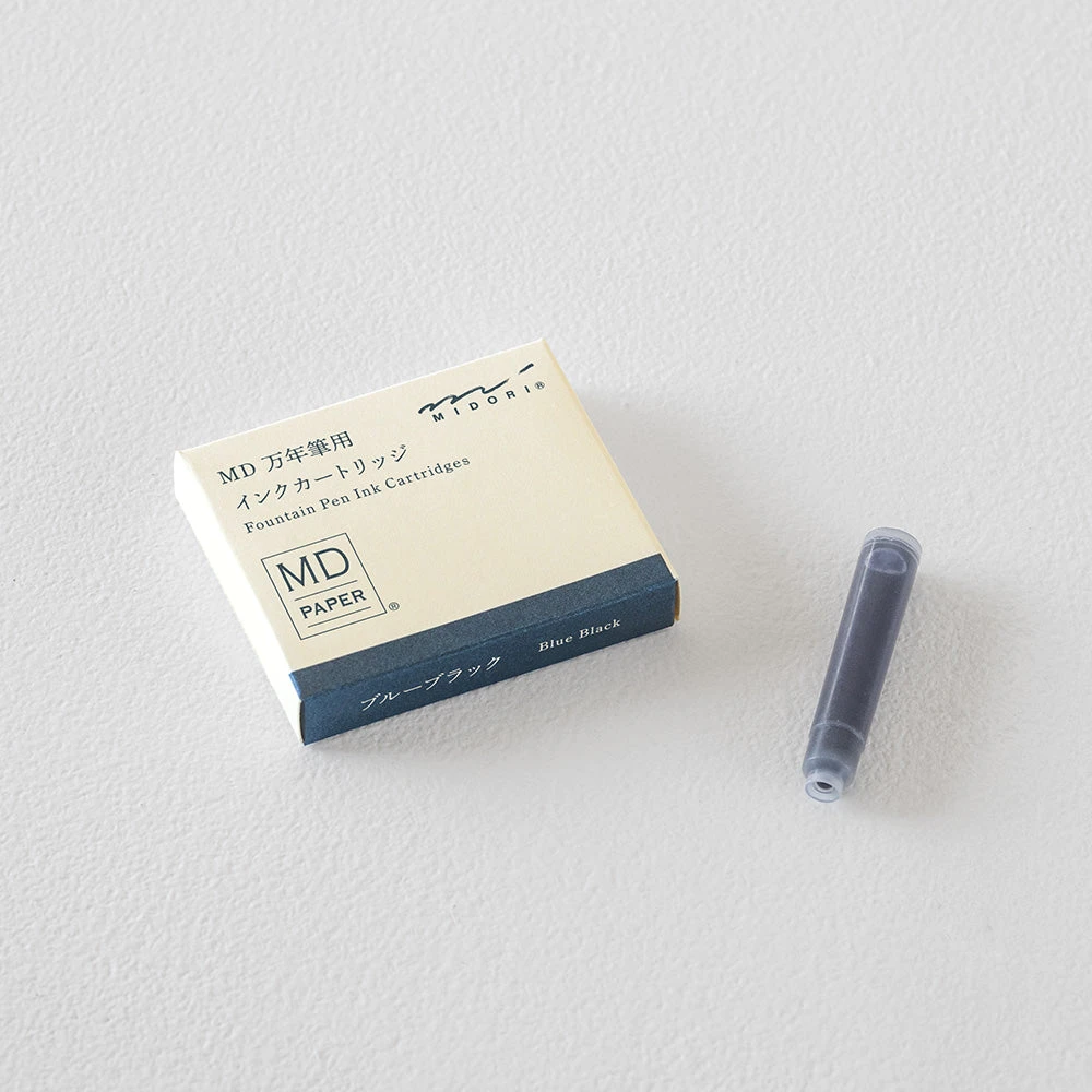 Renowned for their high-quality paper, MD Paper now extends their expertise to the realm of ink. This pack Midori MD Paper Ink Cartridges includes six standard international short ink cartridges designed to flawlessly fit your MD Paper Fountain Pen, as well as any other pen that accommodates the standard short size. Choose from the deep, classic black or the nuanced blue-black to transform your writing into an art form. The cartridges promise a smooth flow of ink to nib, although patience is a virtue – give it time to reach the nib once the cartridge is replaced. Not water-resistant, the ink promises an authentic experience, perfect for those who value the timeless elegance of traditional writing instruments.