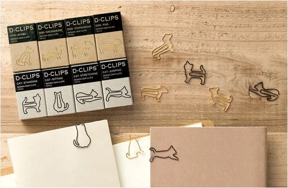 Midori’s D-Clips paperclips are one of our customers’ favourite little pieces of Japanese stationery – probably for their cute factor. Well they now get even cuter with these D-Clips Mini sets, which come in a matchbox sized case. Using them creates an animal silhouette on your papers, in this case a stretching cat. The range is made up of 8 different sets, with four cat poses (in black) and four dog poses (in gold).