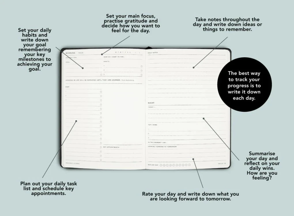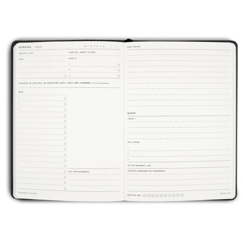 In a nutshell, this is a 90 day progress journal that helps you set your 90 day goal, track your daily successes and review your monthly accomplishments.