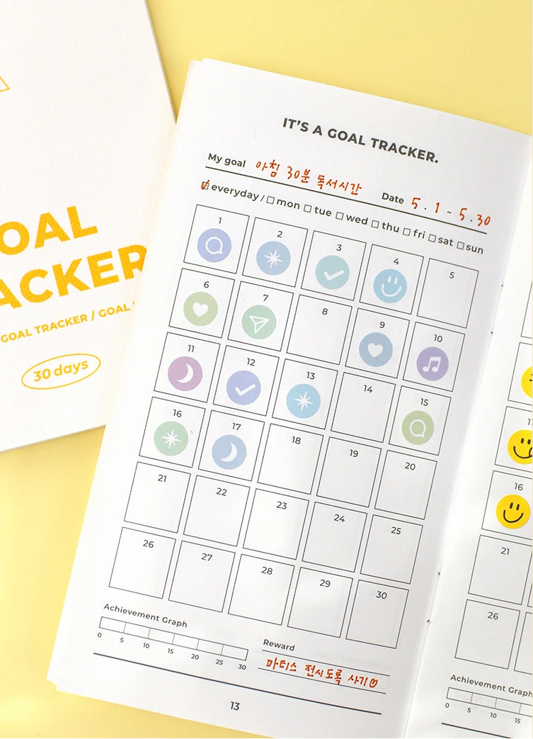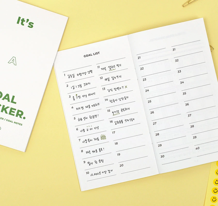 - Systematic layout: Start page, goal list, goal tracker, goal notes, finish page
