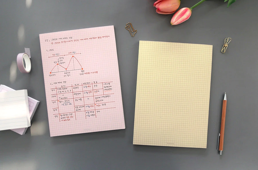 Our notepads feature a non-adhesive design for easy and clean tear-off. Choose from eight vibrant colour options to match your style or purpose. The Line and Letter notepads have a 7mm ruling, the Grid notepad features a 4mm grid, and the Wongoji notepad comes with a 360 character structure.