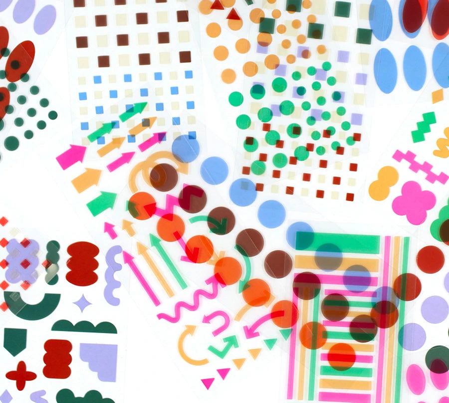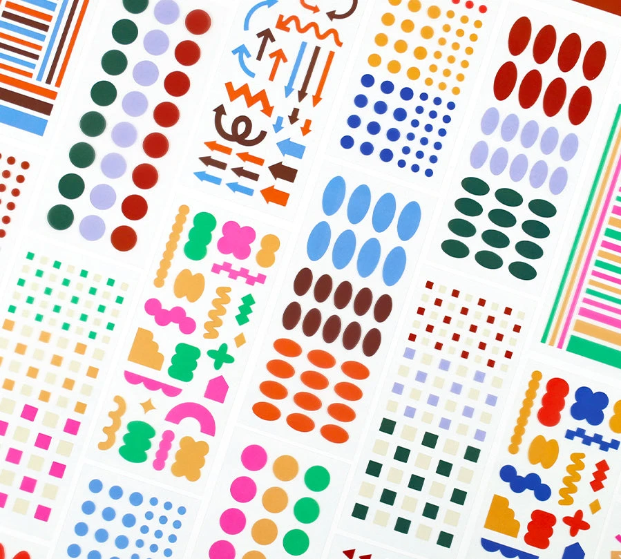 Palette Harmony: Each shape sticker is crafted by blending two out of the 12 vibrant colours, ensuring a unique, yet harmonious look.
