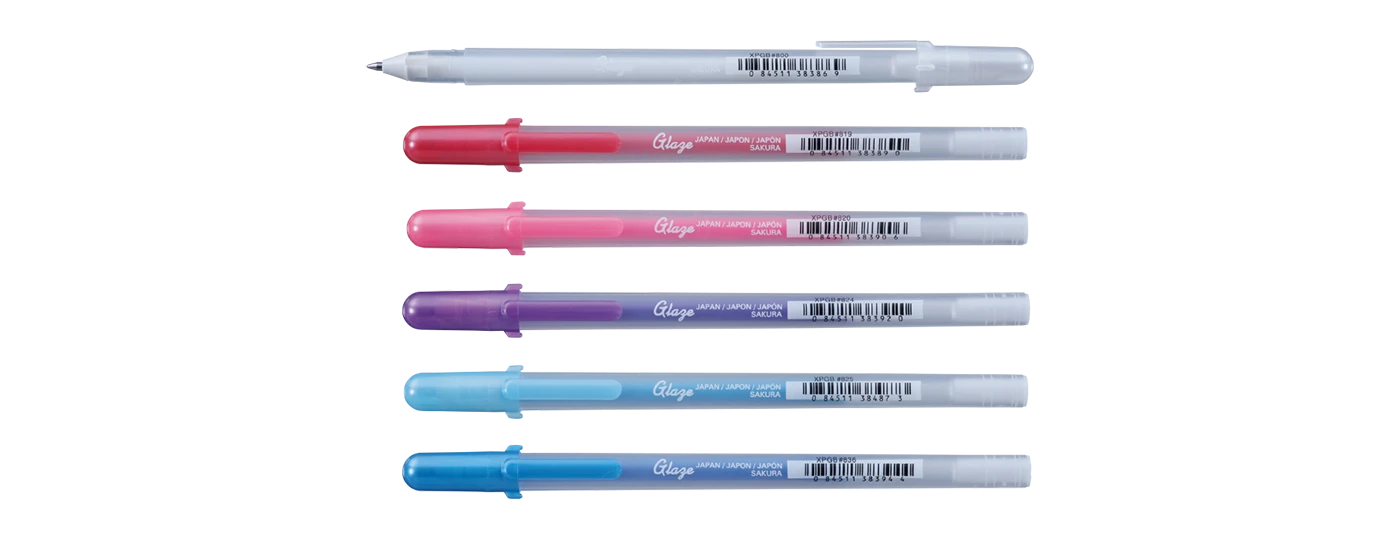 Gelly Roll Glaze 3D gel pens by Sakura are exceptional gel pens that will allow you to add a glossy third dimension to your creative projects. The gel ink features a special 3D effect leaving a translucent raised ink line with a glossy look. Gelly Roll Glaze 3D pens can be used on lots of different smooth surfaces, including plastic, metal, glass, paper and cardboard. The 0.8mm ball produces a broad 0.7mm line width in lots of bright colours. Gelly Roll ink does not bleed through most papers and vellum and has a 60 second drying time.