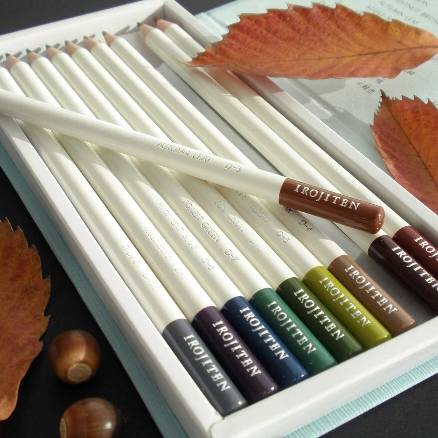 The Tombow Irojiten logo is printed on the spine and cover of each set, in silver hotfoil, Stack the pencils on your desk or shelf, upright or horizontally, and you won’t be able to help but admire how pretty the set looks! No detail has been spared, from the colours right down to the fabric-like feel of the boxes.