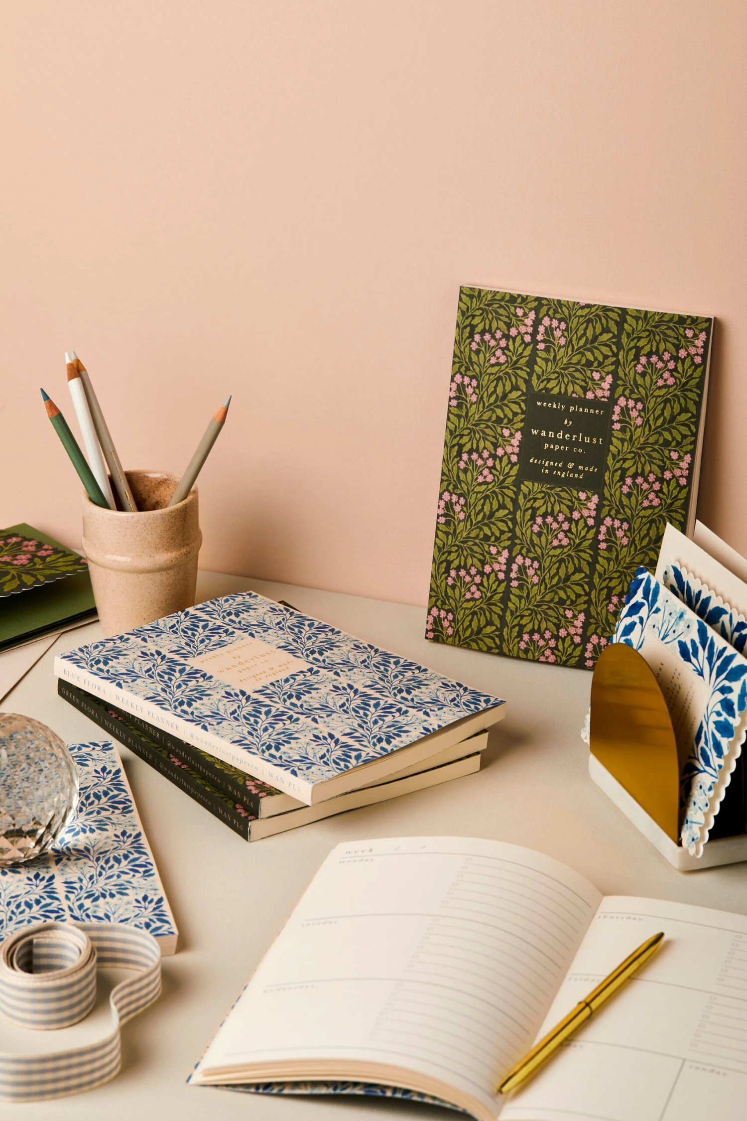Proudly designed and manufactured in England, the Wanderlust Blue Flora Weekly Planner exemplifies quality craftsmanship and attention to detail. Its durable construction and timeless design make it an ideal companion for staying organised and inspired throughout the year.